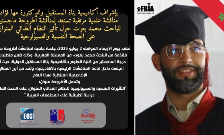 أكاديمية بناة المستقبل الدولية تستعد لمناقشة أطروحة ماجستير للباحث محمد بعوت حول تأثير النظام الغذائي المتوازن على الصحة النفسية والفسيولوجية