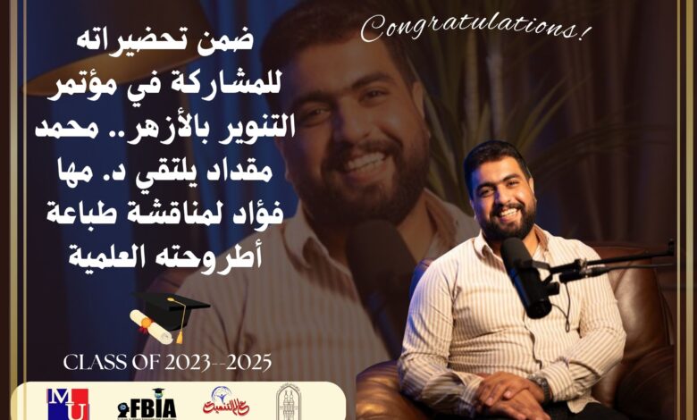 والتقى محمد مقداد بالدكتورة مها فؤاد، رئيس أكاديمية بناة المستقبل الدولية، في مدينة الدار البيضاء، لمناقشة التفاصيل التنظيمية المتعلقة بطباعة بحثه العلمي، المقرر مناقشته رسميًا ضمن فعاليات مؤتمر التنوير بالأزهر الشريف.