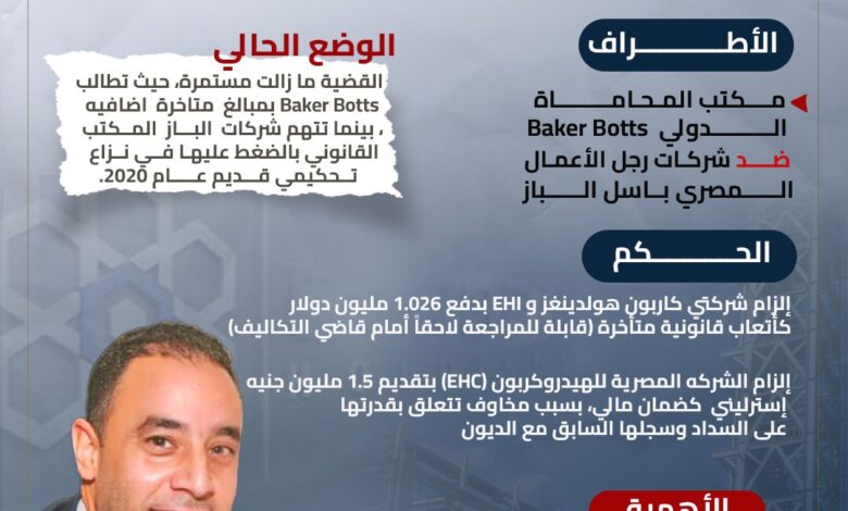 ويعود النزاع إلى تحكيم جرى عام 2020، حيث تتهم شركات الباز مكتب Baker Botts بممارسة ضغوط غير عادلة للتوصل إلى تسوية مالية، فيما تؤكد الشركة القانونية أن مطالبها تستند إلى اتفاقات واضحة وأتعاب لم تُسدّد بالكامل، وتسعى حاليًا لتحصيل مبالغ إضافية مستحقة لها.